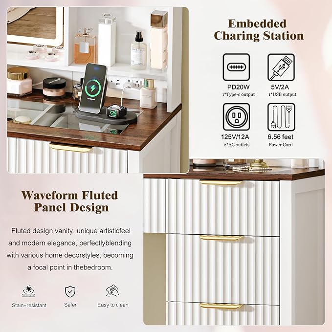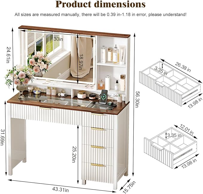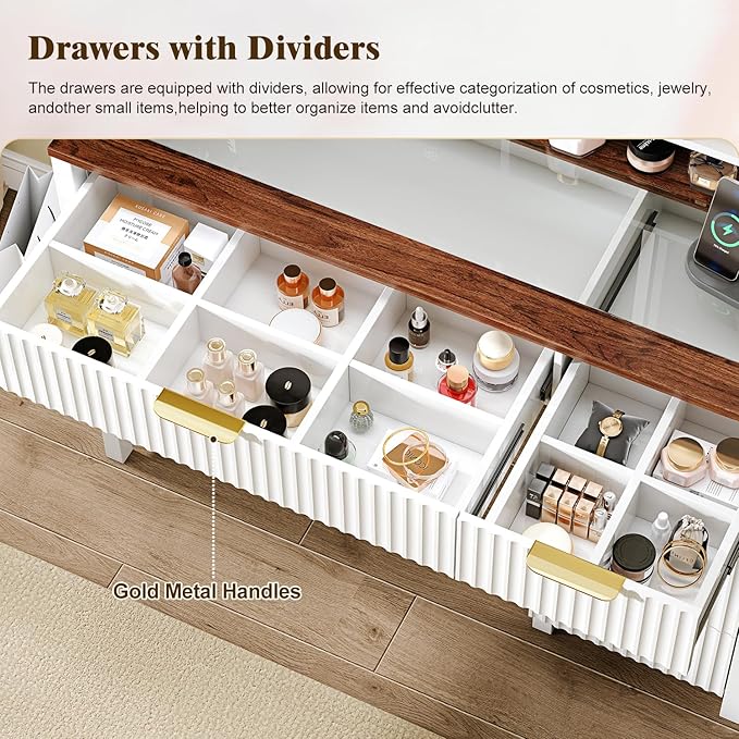 - 【Large Capacity Space 】The vanity is equipped with 5 oversize drawers and 2-layer side storage shelves for cosmetics. It provides ample storage space to store your jewelry, hair accessories and cosmetics, so that you can have a neat and tidy desktop.