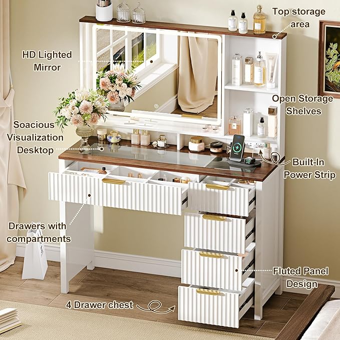 43" Large Vanity Desk with 30" HD Lighted Mirror,Modern Vanity Desk with Mirror and Lights, Makeup Vanity with 5 Drawers and Storage Shelves and Charging Station, White