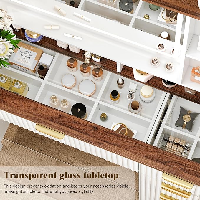 - 【Sophisticated Glass Top】Crafted with a sleek White finish, this vanity desk exudes elegance and sophistication. The glass top adds a touch of luxury while also being easy to clean and maintain. The spacious surface provides ample space for your cosmetics, brushes, and other beauty essentials.