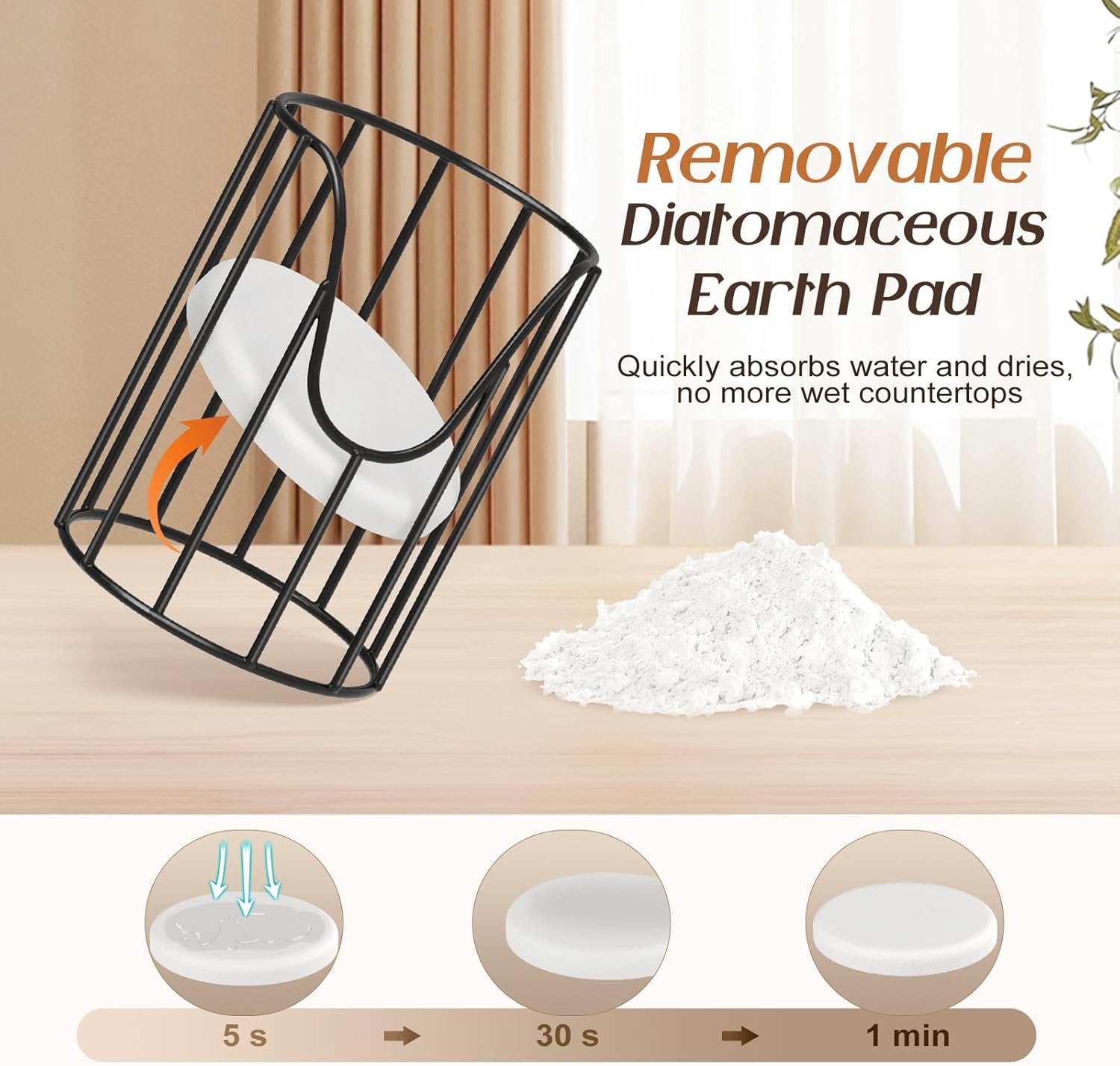 - Diatomaceous Earth Pad: The Dixie cup dispenser comes with a removable food-grade diatomaceous earth pad, which quickly absorbs water and dries in minutes. It effectively prevents plastic and glass cups from growing bacteria due to stagnant water. When the pad gets dirty, simply detach it and rinse it with water for easy cleaning and maintenance.