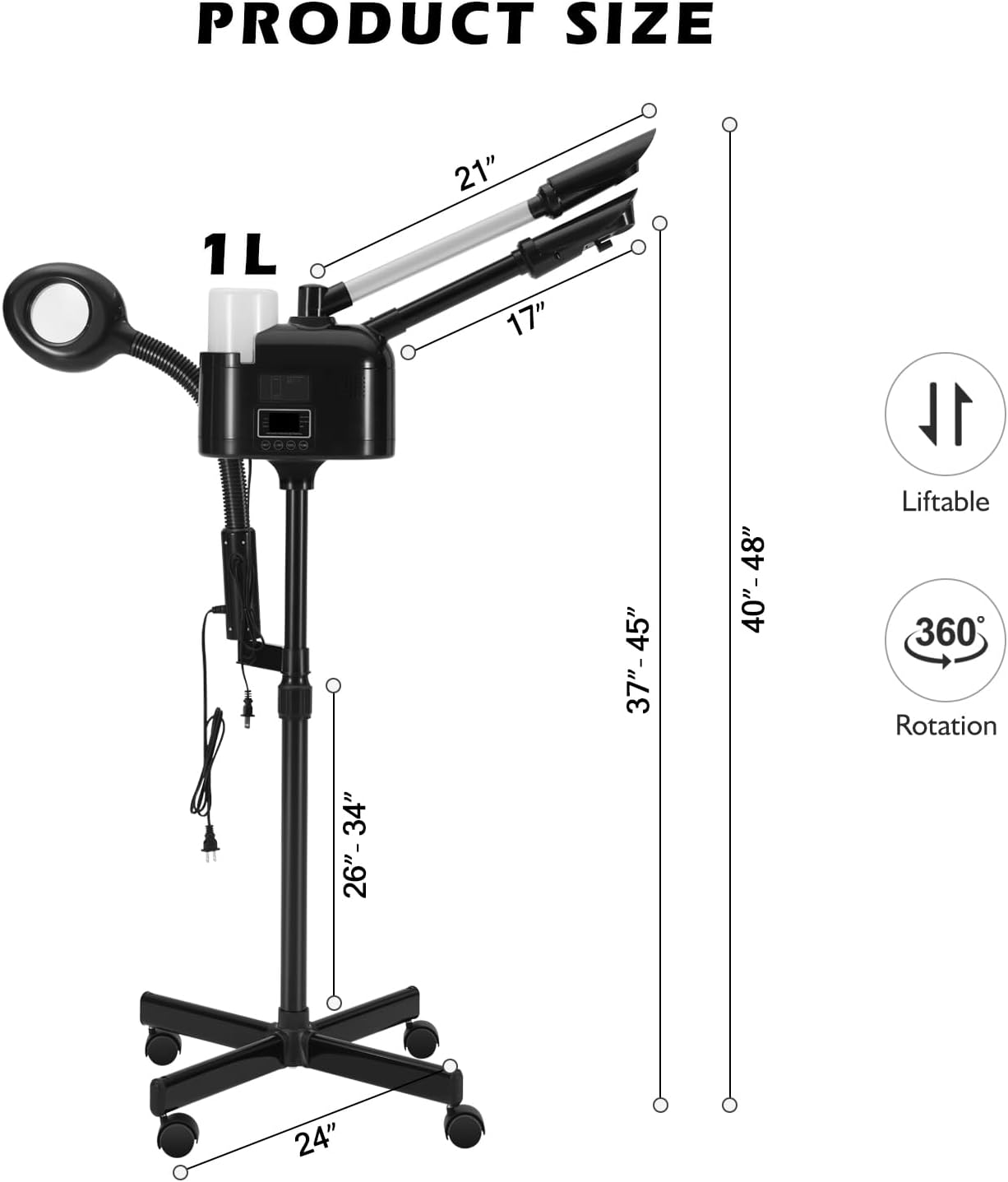 - ROTARY AND MOVEABLE - 360 degree rotary spray pipe allows to moisturize your face; Rolling wheels makes it convenient to move this facial skin care machine around the room. There is an aroma diffuser at the nozzle mouth, you can put the aroma diffuser and use it