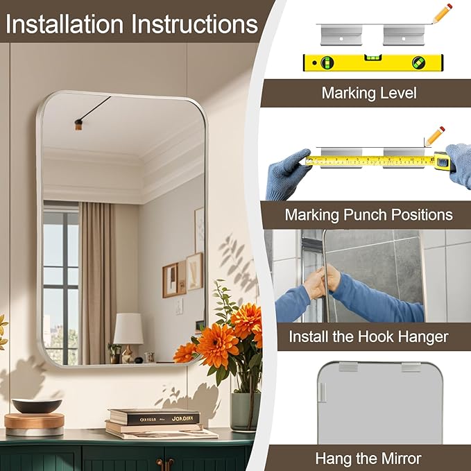 - Easy to Install: The brushed mirror is equipped with complete installation accessories, including expansion screws, hooks, etc., and detailed instructions. You only need to fix the screws on the wall to install the framed mirror.