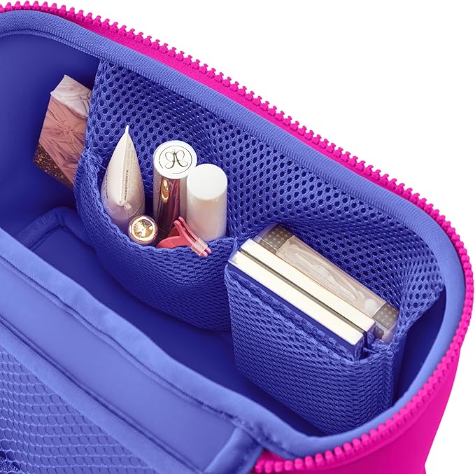 KUSSHI Neoprene Train Case Makeup Bag - Washable Makeup Travel Bag & Vanity Case for Stress Free Travel (Small, Pink/Indigo)
