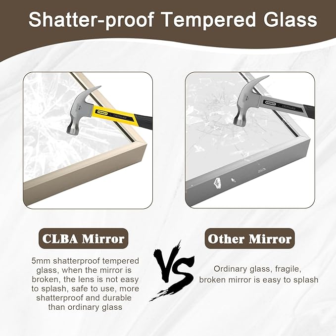- HD Tempered Glass for Clear Reflection: Crafted with 5MM HD tempered glass, this brushed nickel mirror guarantees 1:1 distortion-free imaging, eliminating blurs or warps. The smooth surface is easy to clean, making it an ideal choice for daily use in vanity areas. Its high-transparency glass ensures vivid reflections, enhancing both functionality and aesthetics.