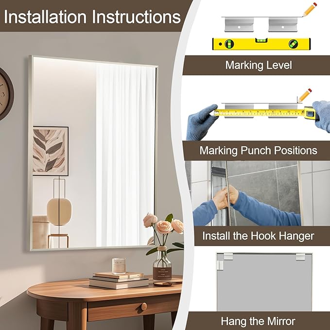 - Easy to Install: The vanity mirror is equipped with complete installation accessories, including expansion screws, hooks, etc., and detailed instructions. You only need to fix the screws on the wall to install the framed mirror.