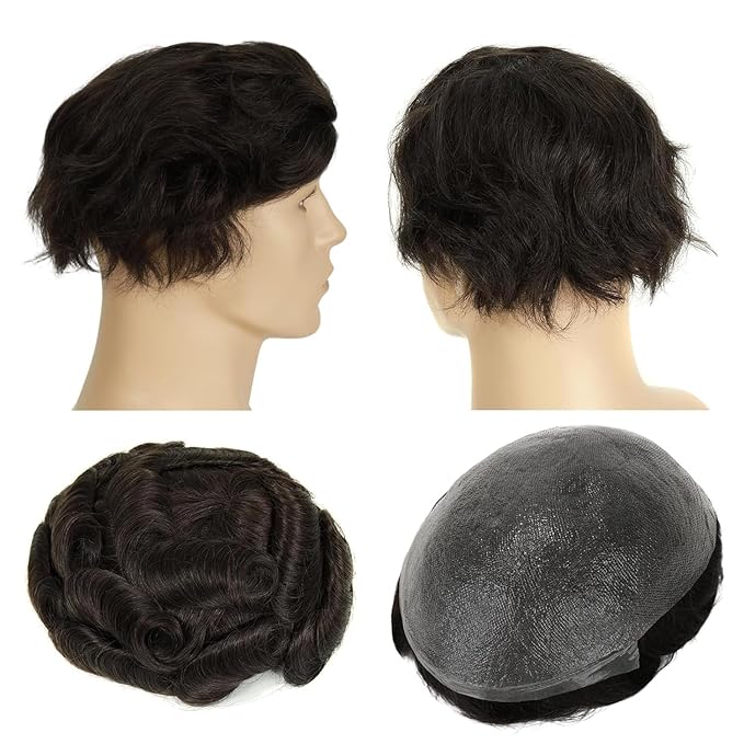 0.08mm Thin Skin Toupee for Men, Remy Human Hair 8x10 Inch PU Base 110% Medium Density Knotless V-Looped Hairline #1B Natural Black