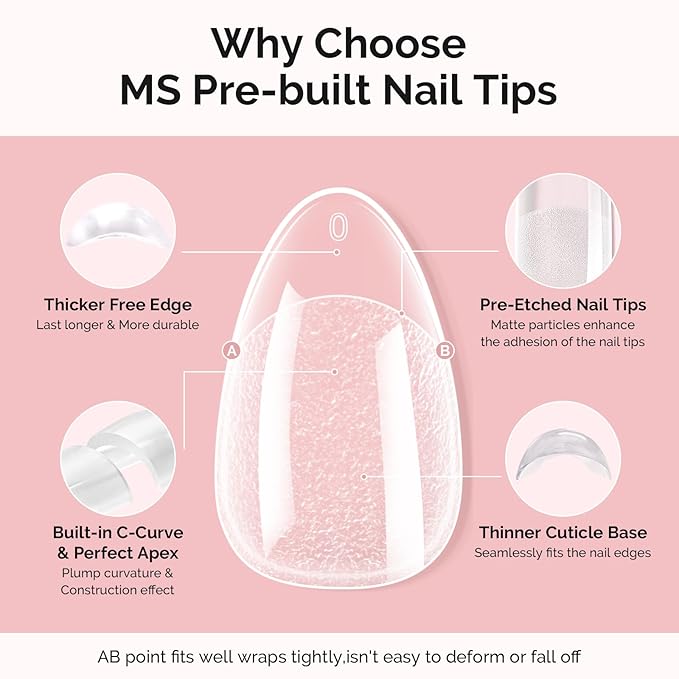- Unique Gradient Thickness Design: The front edge of MS pre-built apex nail tips is thicker to ensure durability and resistance to cracking, while the thinner back edge fits snugly against your nail bed. The built-in C-curve design and perfect apex help reshape the nail’s highest point, creating a full, three-dimensional and attractive nail shape.