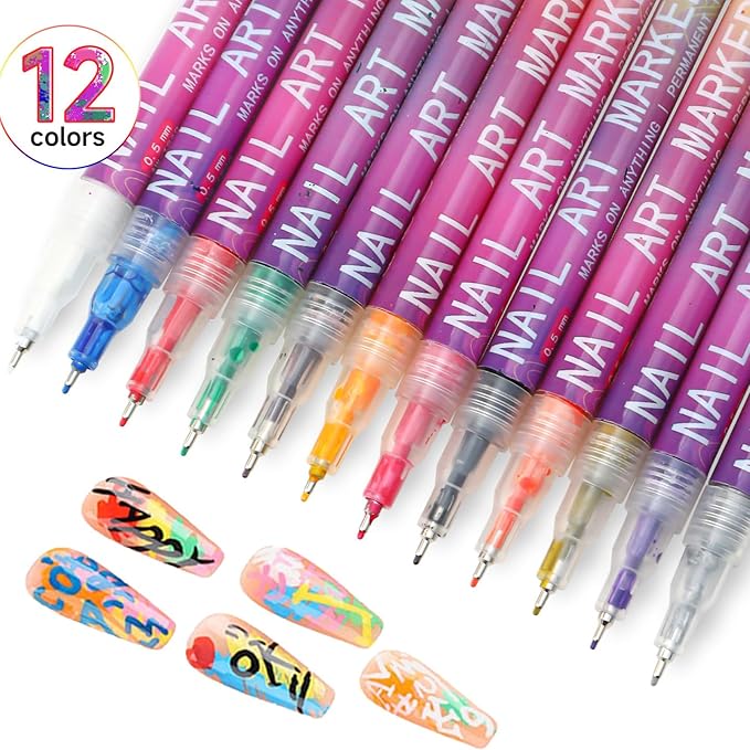 - 【Vivid Colors Variety】This nail marker set offers 12 bold and vibrant colors, allowing you to create eye-catching nail designs. The fine tip ensures precise lines and intricate details, making your nail art stand out with rich, opaque pigment for salon-inspired results.