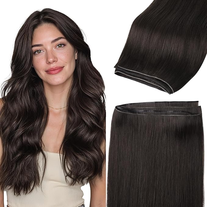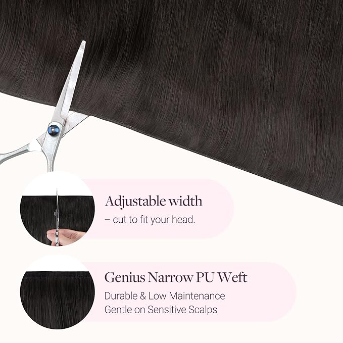GOO GOO Genius Narrow Edge PU Weft Hair Extensions Human Hair, Invisible Sew in Hair Extensions Human Hair, 2 Dark Brown 16 Inch 100g, Seamless Soft Lightweight