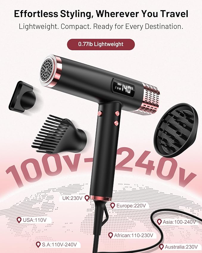 - Lightweight & Ultra-Quiet Travel Hair Dryer: Weighs only 0.77 lbs, noise <65dB. Powerful airflow in a discreet, travel-ready package. An ideal low-noise travel hair dryer for early mornings, shared spaces, and apartment living.