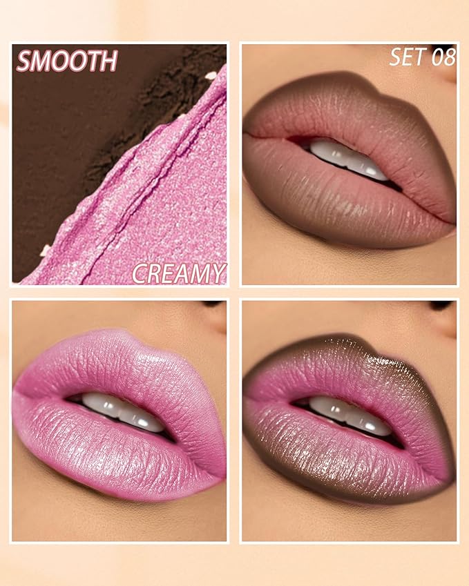 - Shimmer Pink Lipstick with Brown Lip Liner Lips Combo Set - The shimmering pink lipstick contains fine glitter particles that deliver rich color and add a soft, luminous glow to your lips. Paired with a brown lip liner with a pencil sharpener, it precisely defines your lip shape for a clear, sculpted contour while effectively preventing lipstick smudging. Together, they effortlessly create an everyday look, ensuring your lips always look captivating and radiate unique charm.