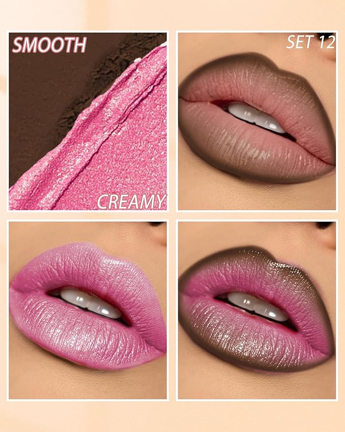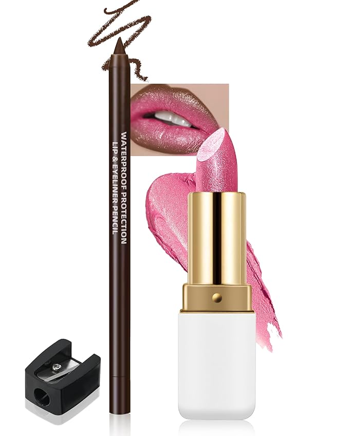 - Shimmer Pink Lipstick with Brown Lip Liner Lips Combo Set - The shimmering pink lipstick contains fine glitter particles that deliver rich color and add a soft, luminous glow to your lips. Paired with a brown lip liner with a pencil sharpener, it precisely defines your lip shape for a clear, sculpted contour while effectively preventing lipstick smudging. Together, they effortlessly create an everyday look, ensuring your lips always look captivating and radiate unique charm.