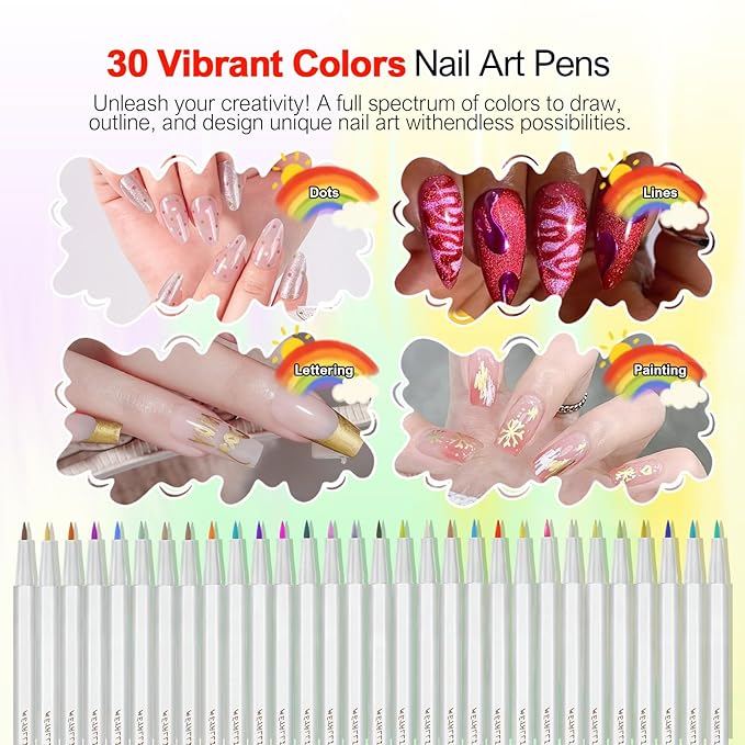 - 🎨 30 Vibrant Colors for Creative Nail Art – This nail art pen set includes 30 bright, vivid colors, perfect for creating endless designs. Great for lines, dots, flowers, and detailed art — ideal for both beginners and professionals.